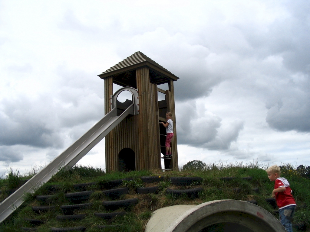 Eenmaal boven in de uitkijktoren kan er via de reuze glijbaan weer naar beneden worden gegleden.