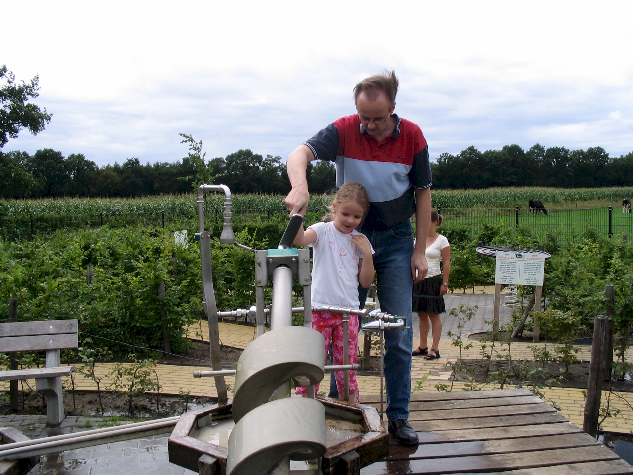 Pomp het water op en zie wat er gebeurd. Met draaibewegingen komt het water omhoog en als een mini waterval gaat het weer terug.