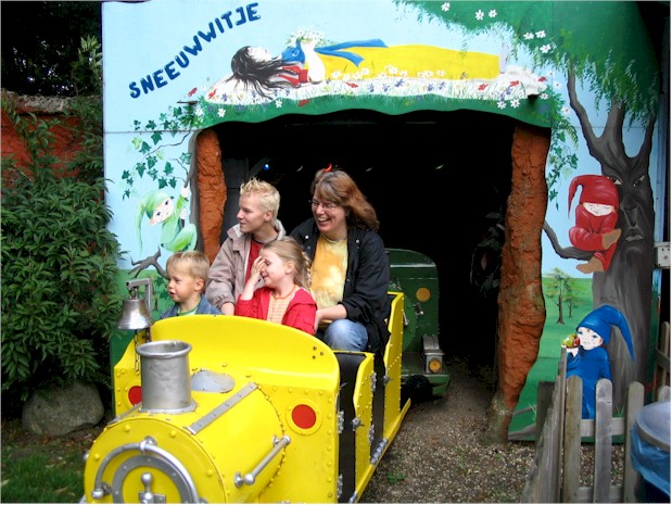 Het is leuk om met het treintje te rijden. In de tunnel zie de dwergen aan het werk en zie je het kistje van Sneeuwwitje.