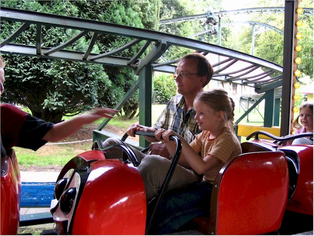 Samen met oom Ronald in de achtbaan. Het is erg spannend en gaat heel snel. Broerlief Eric steekt nog een hand uit om je vast te houden.