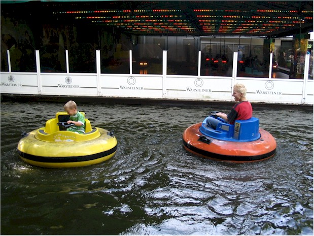 Een keer wat anders dan botsauto's: de neven samen in de botsboten. Hard botsen met elkaar en lekker nat worden. Dikke pret!