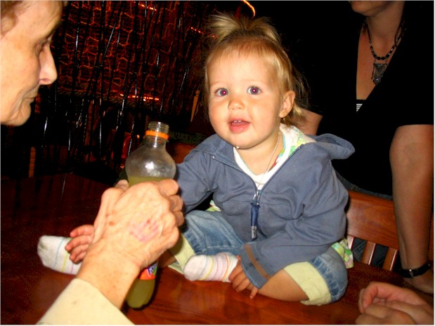 Na al het spelen even naar binnen gegaan, uitrusten en dan even wat lekkers drinken. Oma helpt graag een handje.
